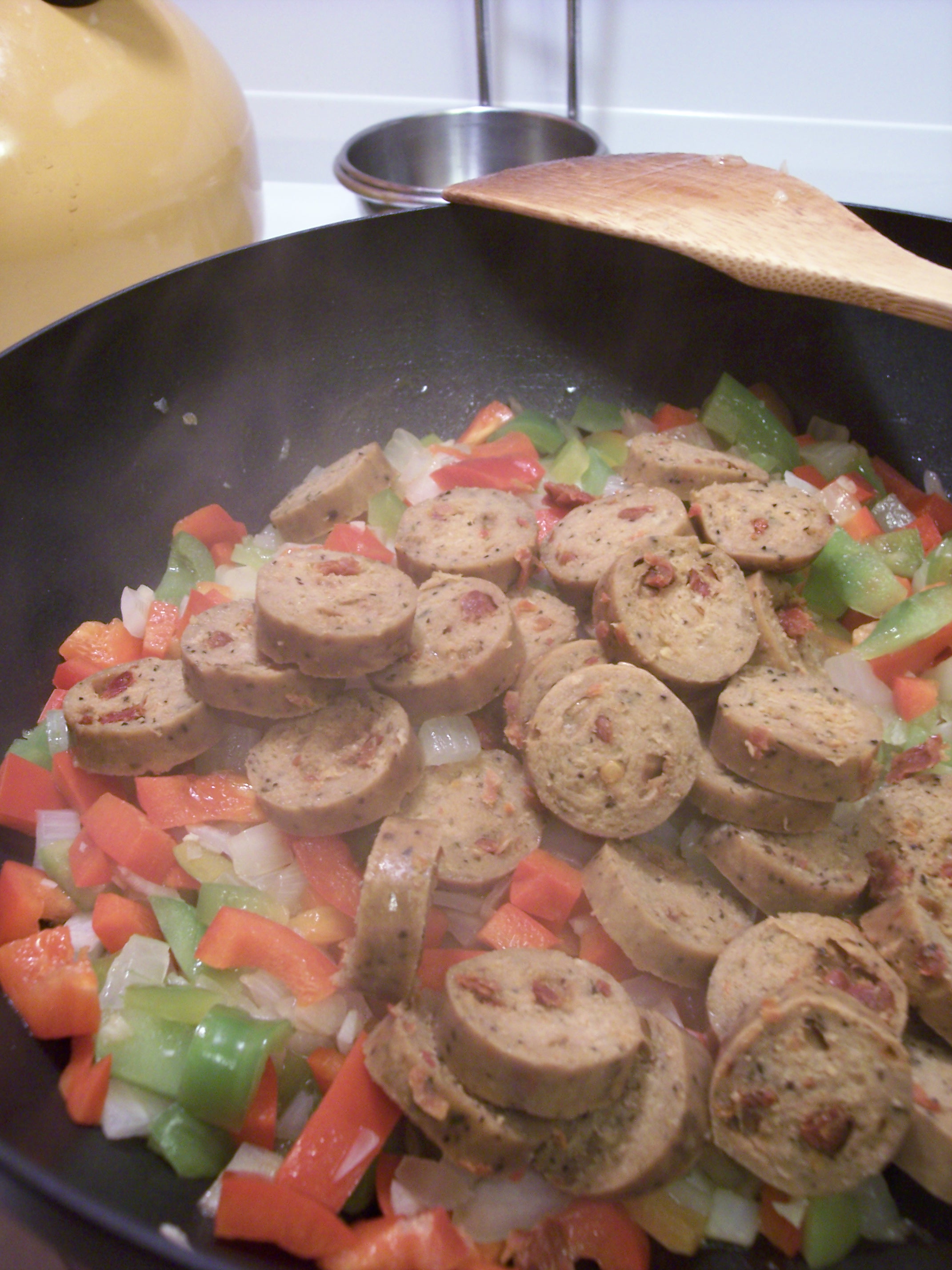 5. Add fake sausages and spices. Cook another 3 minutes.