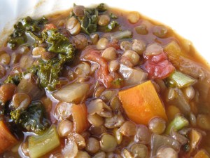 It’s Sunday afternoon and there’s a pot of simmering lentil soup on the stove. It’s been a rainy weekend in San Francisco, and a dinner of healthy, hearty lentil soup to usher in a new week sounds just fine. This soup is of the “chop, chunk, toss, stir and simmer” variety; in other words: pretty simple and very satisfying.