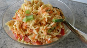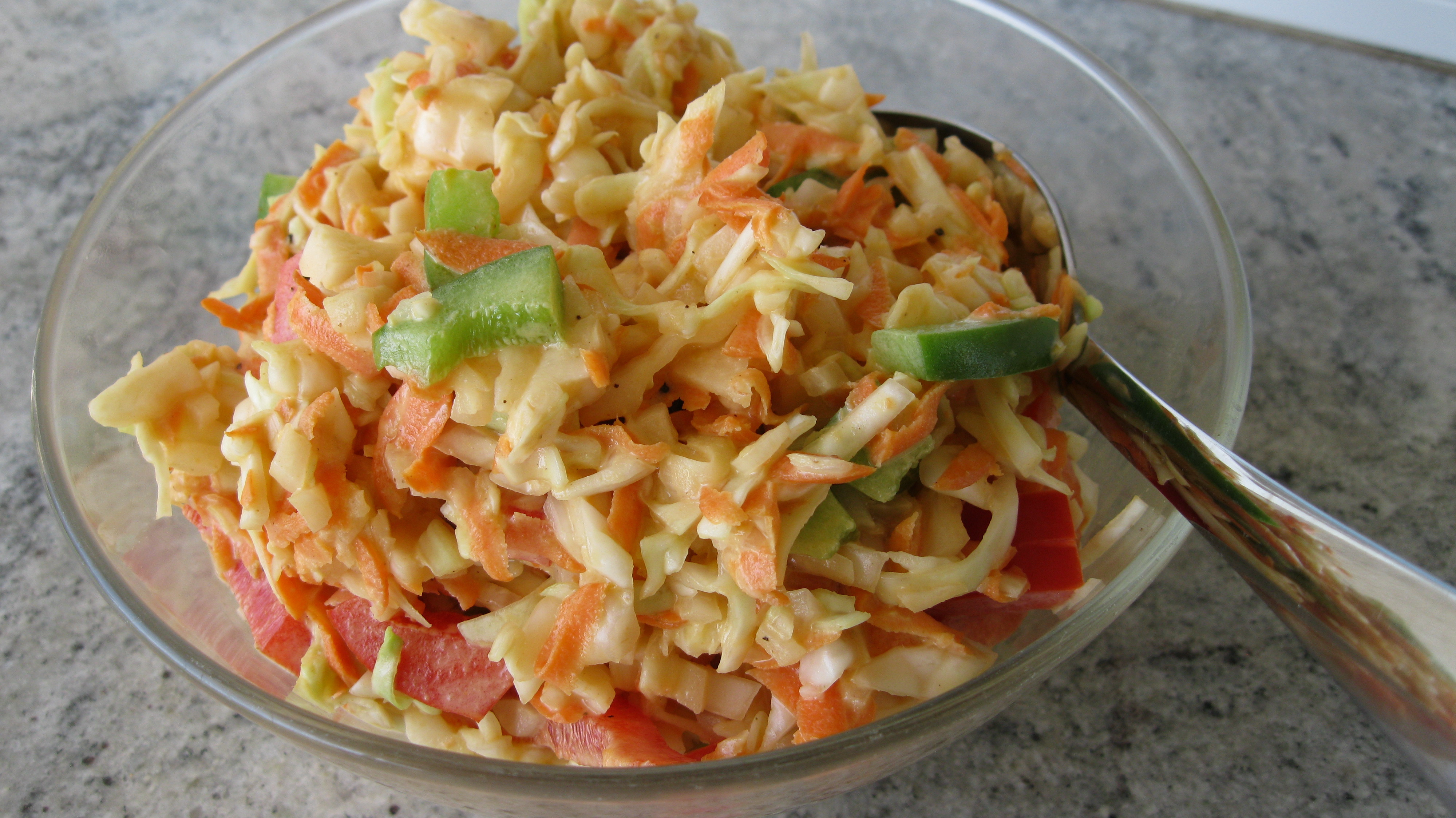 - Prepare cabbage, carrots, onion, and red and green peppers and toss in a large bowl.