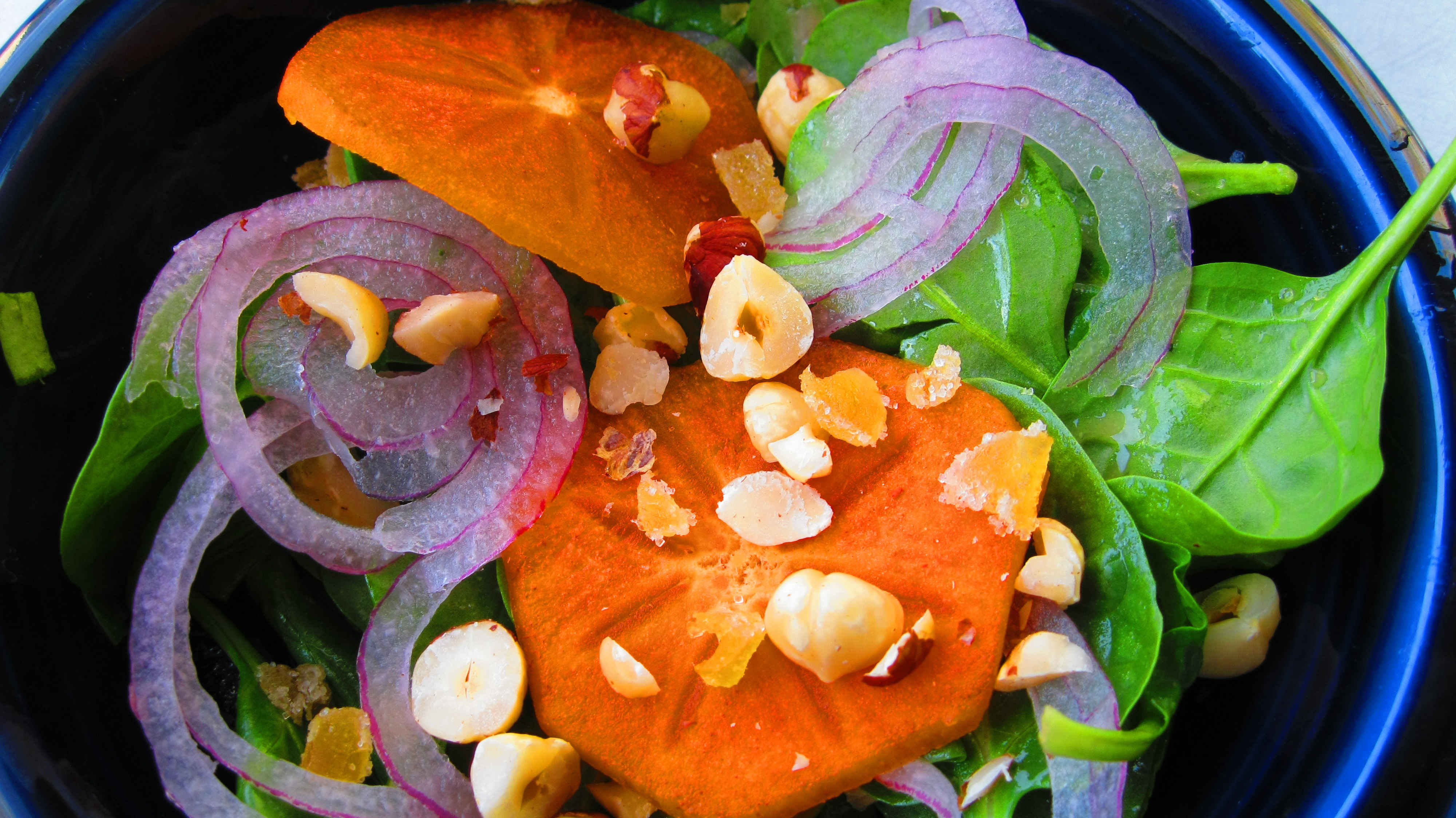 Spinach Salad with Persimmon, Hazelnuts & Candied Ginger