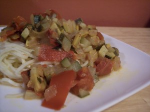 This recipe is born out of multiple requests for recipes that use summer squash. I was also inspired by a podcast by Mark Bittman where he suggests that people should serve pasta with more sauce than noodles as a healthier alternative to the traditional serving portion. This sauce is simple, flavorful and healthy. Perfect for an end-of-the-summer manuever in the battle home-gardeners wage with squash.